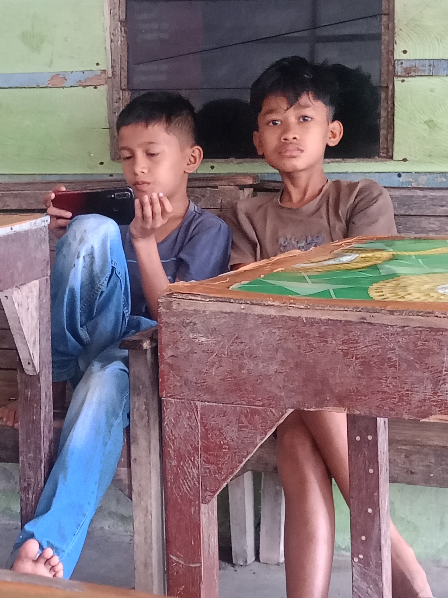 Two young males are depicted seated on a wooden bench in Lhokseumawe, Indonesia. The individual on the left wears a blue t-shirt and light blue jeans, holding a dark-colored smartphone horizontally in both hands, with his gaze directed at the device's screen. His right hand is near his chin, and his bare feet are visible. The individual on the right, dressed in a brown t-shirt, is seated with crossed legs, looking forward. The background consists of a worn wooden wall painted light green with a horizontal light blue stripe. A dark reddish-brown wooden table with a green, yellow, and white patterned surface partially obscures the foreground.