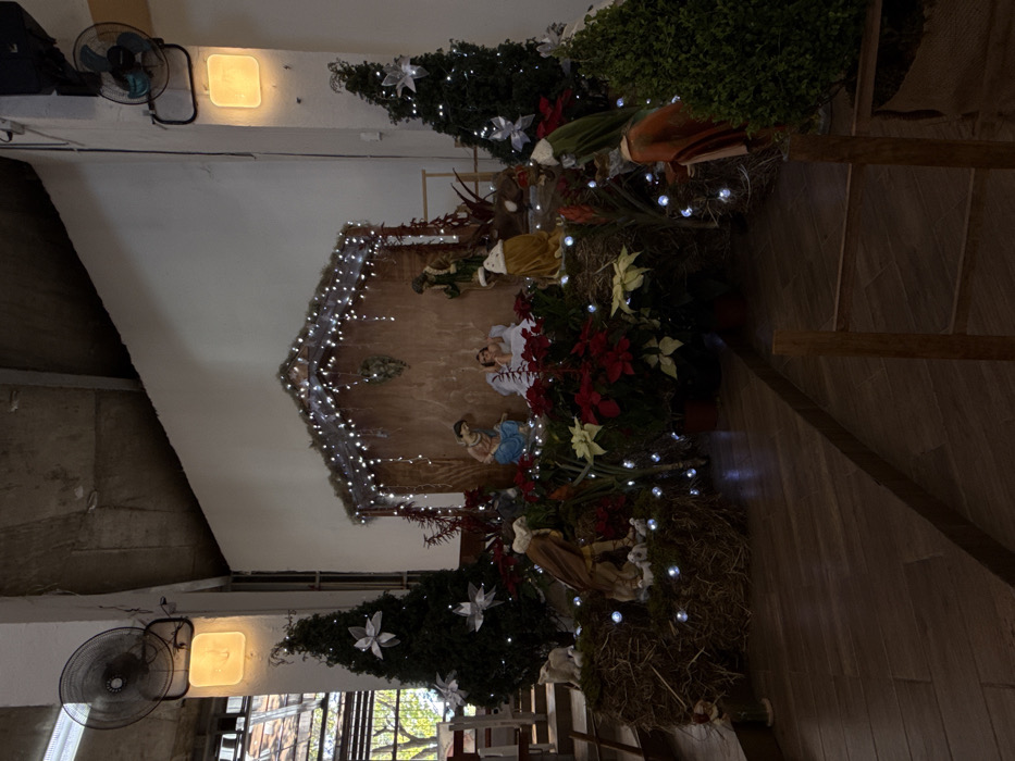 A Christmas nativity scene is displayed indoors. Baby Jesus, Mary, and Joseph are featured in a wooden stable decorated with string lights. Poinsettias, hay, and other greenery surround the stable. Two Christmas trees adorned with silver stars stand on either side. Two fans and a light fixture are visible on the ceiling above the display. Wooden pews and a hardwood floor are also visible.