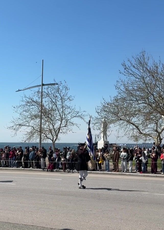 group of traditionally dressed Greek soldiers marching in a parade on a sunny day. They are walking on a paved road lined with red and white tape, with a crowd of spectators standing behind a barricade on the other side. In the background, there is a body of water and a clear blue sky. Trees with bare branches are visible on both sides of the road. The soldiers are wearing black jackets, white leggings, and black shoes with pom-poms. Each soldier is carrying a Greek flag. The camera follows the soldiers as they march, panning from right to left.