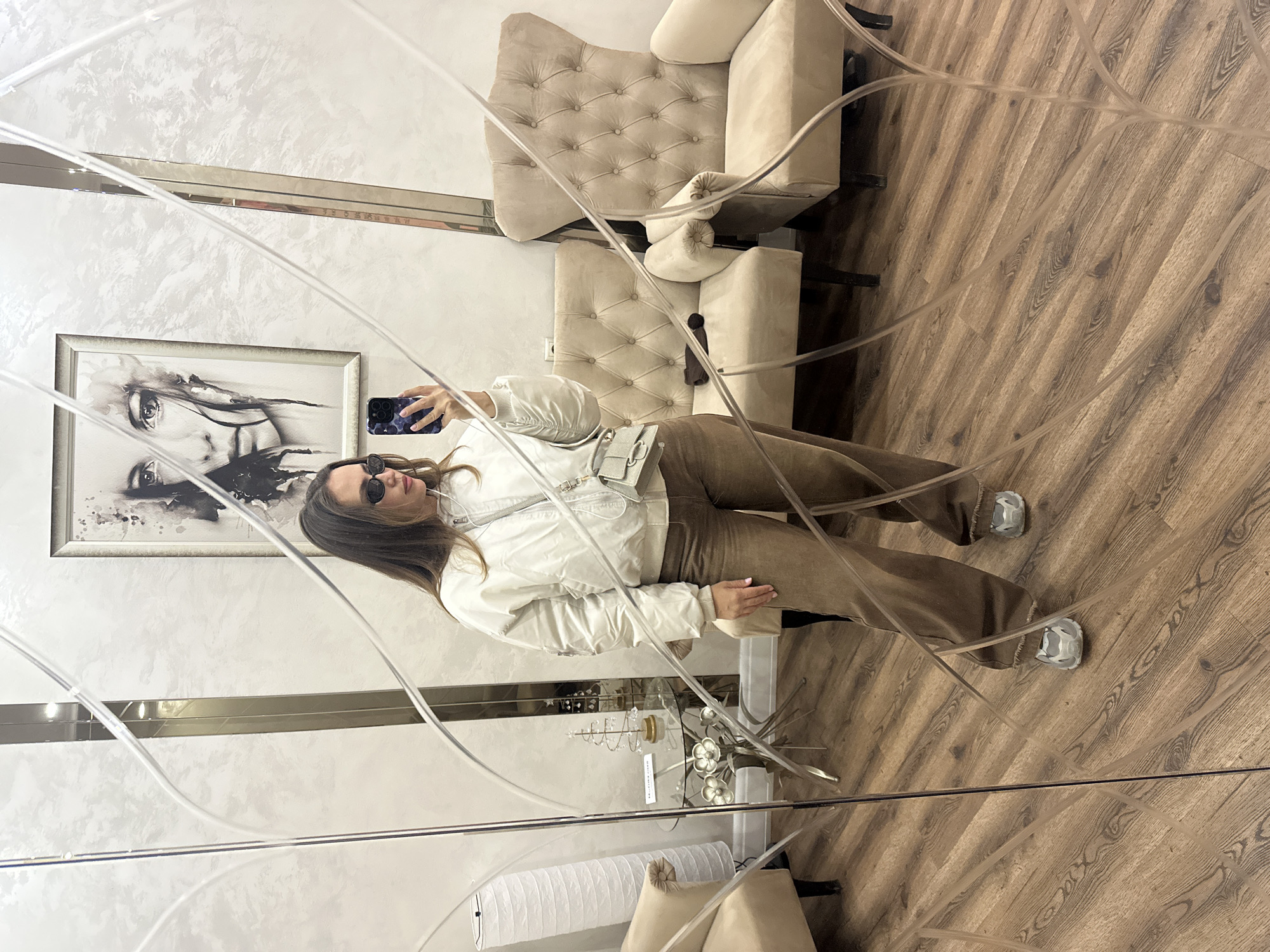 A woman is taking a selfie in a mirror, the reflection includes a seating area and artwork. The location is Surgut, Russia. The reflection shows a woman wearing sunglasses, a white jacket, and brown pants. In the background, there is a beige tufted armchair and an artwork depicting a face. A small table with decorations is also visible, along with wooden flooring. The mirror's surface has decorative elements, partially obscuring the view.