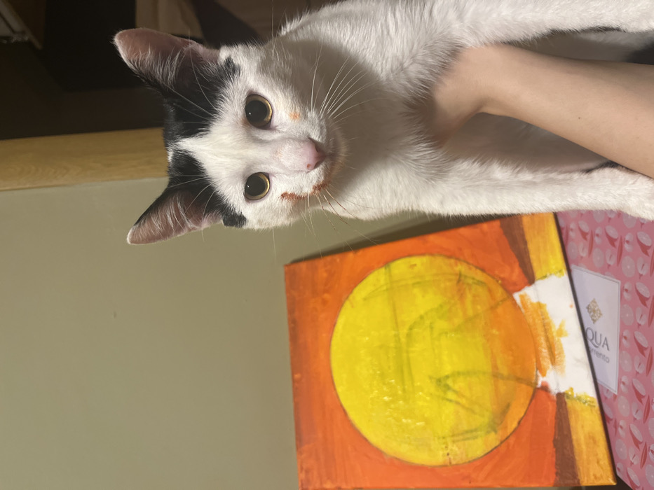 An indoor scene in Varna, Bulgaria, depicts a domestic shorthair cat being held by a human hand. The cat is predominantly white with black markings on its head, covering its ears and extending between them. Its fur around the nose, mouth, and on its left cheek is stained with orange/red paint. The cat possesses amber-colored eyes and is facing the viewer directly. To the left and slightly behind the cat, a small canvas painting rests on a patterned pink surface. The painting features a large, central yellow circle against an orange background, with a dark horizontal line near the bottom and an irregular white shape extending upwards from it. Below the painting, a white cardboard item with partially visible text, including "QUA," is positioned on the pink surface, which displays a repeating pattern of light-colored, possibly fruit-like, shapes. The background wall is a solid light olive-green, with a segment of a vertical wooden doorframe or trim visible on the right. The lighting appears to be artificial, illuminating the subjects from the front.