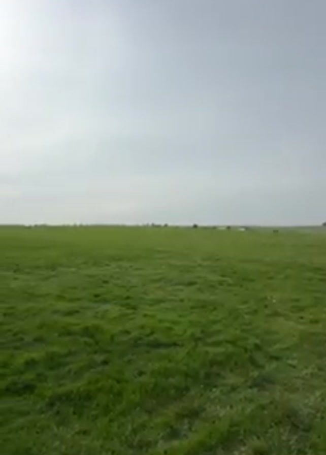 wide, grassy field under a bright sky with the sun peaking through the clouds
