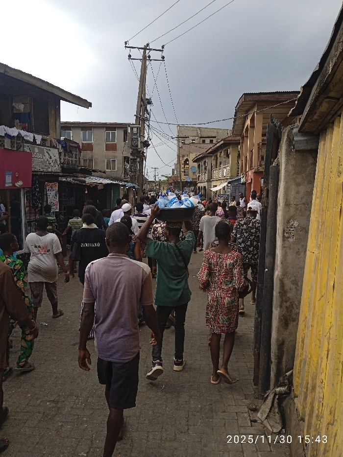 The image displays a bustling urban street scene in Akowonjo, Nigeria, under an overcast, grey sky. A dense crowd of pedestrians occupies a paved roadway, moving in various directions. In the immediate foreground, a male subject in a light purple t-shirt and dark shorts walks away from the viewer, alongside a female in a multi-colored patterned dress who is also walking away. In the mid-ground, a person wearing a green shirt carries a dark basin filled with numerous plastic bottles of water balanced on their head. Other individuals, dressed in diverse casual attire, including some wearing head coverings, are visible throughout the street. The street is flanked by multi-story buildings. On the left, structures feature ground-level shops with visible signage, and clothes are displayed or drying on an upper-level balcony. A grey, multi-story building with multiple windows is visible further down the street on the left. Dominating the central background is a tall wooden utility pole with a dense network of tangled overhead electrical wires extending across the street. Buildings on the right side of the street display older architecture with balconies, leading to a concrete wall and a yellow corrugated metal fence in the right foreground. The ground surface appears to be constructed of interlocking concrete pavers or blocks. The timestamp "2025/11/30 15:43" is present in the lower right corner.