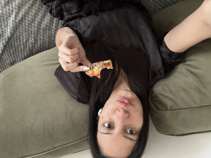 The image captures a young adult female taking a selfie indoors. She has long, dark hair and brown eyes, looking directly at the camera with pursed lips. A white wireless earbud is visible in her right ear. She is wearing a dark, short-sleeved collared shirt with subtle vertical stripes. In her right hand, she holds a partially eaten slice of pizza, displaying a distinct bite mark; her fingernails are manicured with white tips. She is seated on an olive-green upholstered sofa, with a grey knitted blanket visible to her right. The scene provides no discernible details to identify a specific location within the city of Nesebar, Bulgaria.