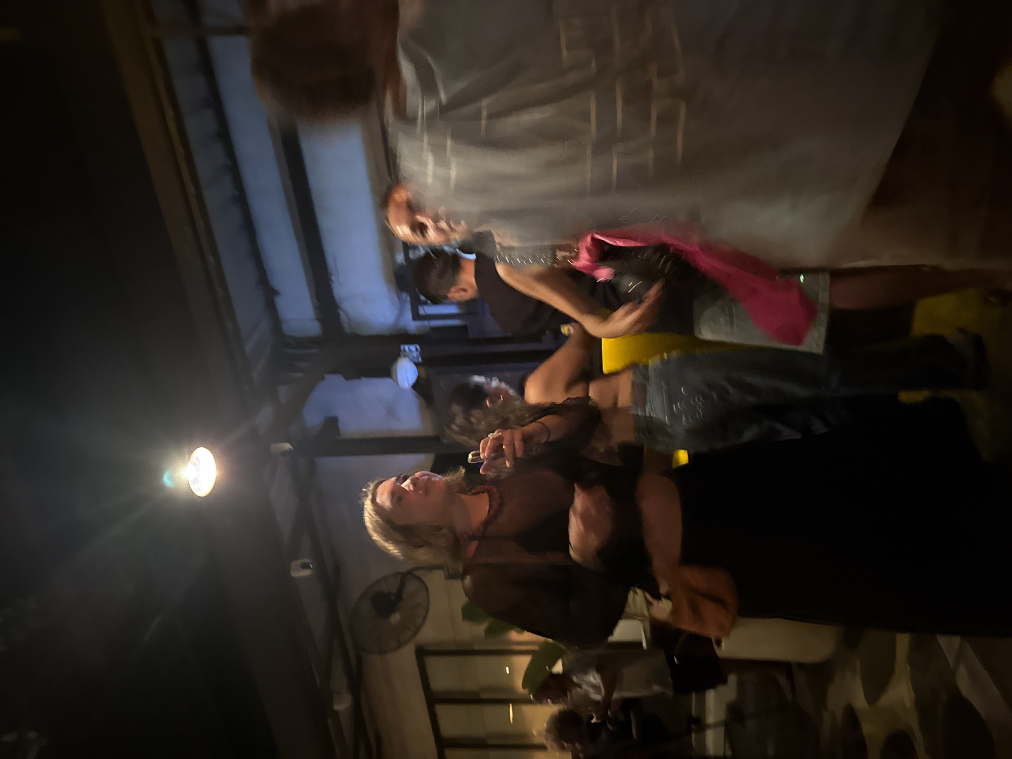 n indoor scene, possibly at a bar or restaurant in Kuta Selatan, Indonesia. Several people are present. A woman with blonde hair and dark clothing is in focus, holding a glass. Behind her, other people are interacting, including a man wearing a dark shirt and holding a camera. A light fixture shines in the upper-left corner. The setting appears to be dimly lit with visible ceiling structures, a fan, and portions of interior design.