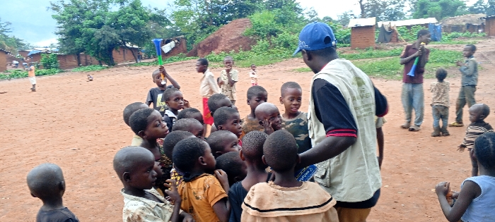 A group of young children, likely in a village, are gathered around an adult male who is wearing a blue cap and tan vest. Some children are looking at the adult, while others are looking away. In the background, other children are playing, some holding blue and green horns. Houses or buildings are visible in the background, and the ground is dirt or sand. The setting appears to be a rural or impoverished area.