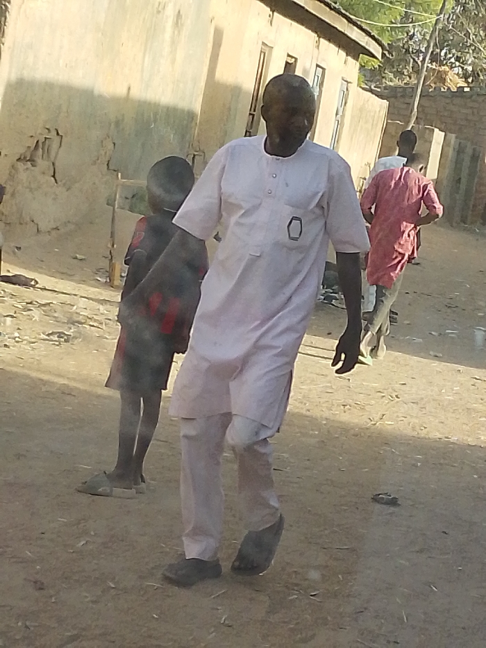 An older man walks on a dusty street, wearing a light pink, long-sleeved traditional outfit and dark shoes. He walks past a child in a patterned shirt. Behind him, another person in a reddish shirt walks further away. Buildings, likely residences, line the street, with one close by displaying weathered, sun-faded walls. The scene appears to be set in a rural or less developed area.