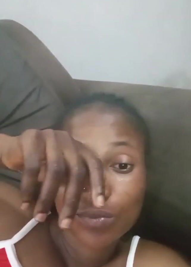 A woman with dark skin and black hair pulled back lies on a brown couch, covering her eyes with her hand. She is wearing a red tank top with white trim. A nose ring is visible. The background is a plain white wall.