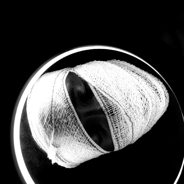 A monochromatic, tilted close-up image features a person's head tightly wrapped in a bandage-like material. The eyes are closed and dark against the white wrapping, which is overlaid with a fine mesh texture. A luminous white ring partially encircles the head, casting a subtle glow. The background is a deep black, providing a stark contrast that intensifies the focus on the bandaged figure.