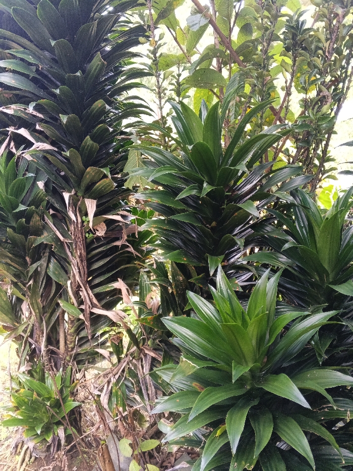 A dense cluster of lush green plants dominates the frame. The plants feature long, pointed leaves arranged in spiral formations. Some plants appear darker and denser, while others boast brighter, more vibrant green hues. Brown, woody stems and dry, decaying leaves are visible near the base, adding a textural contrast. Other plants with smaller leaves are interspersed in the background, creating depth and adding to the overall sense of a tropical garden.