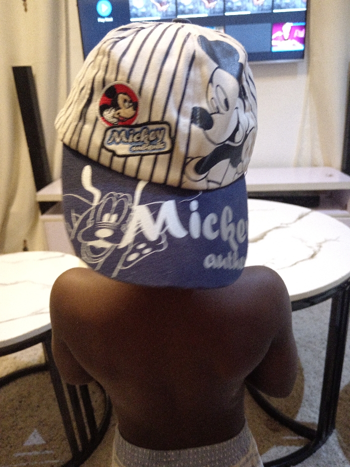The image depicts a person viewed from behind, positioned indoors in Ijoko, Nigeria, facing a flat-screen television. The individual, exhibiting dark skin, has their upper back visible and wears a light-colored, patterned lower garment. Two distinct items are worn on the head. The uppermost item is a white baseball cap with vertical black stripes, featuring a large black outline graphic of Mickey Mouse on the right side. On its left side, a circular red-bordered patch depicts Mickey Mouse's head, accompanied by a rectangular embroidered patch reading "Mickey" in blue script over "Authentic." Beneath this cap, a blue fabric head covering is present, adorned with a white outline graphic of Pluto on the left and "Mickey authentic" in white script on the right. The background features a large flat-screen television mounted above a light-colored console, displaying multiple smaller visual elements including a play icon. Partially visible in the foreground, flanking the subject, are two round tables with white, marble-patterned tops and dark metal legs.