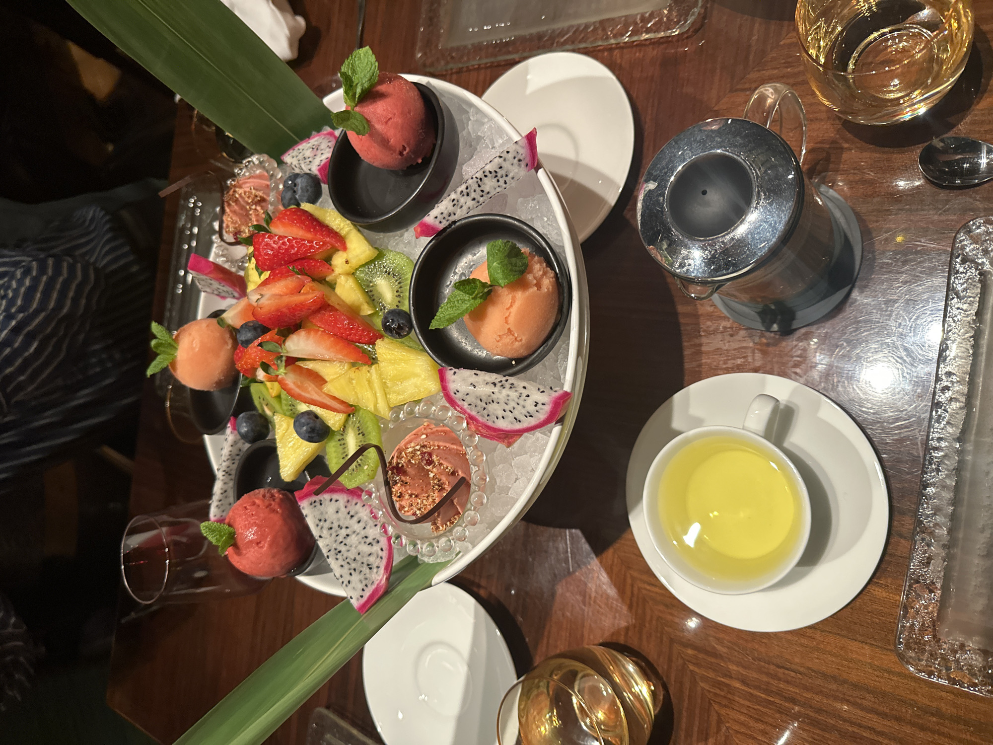 A table setting is captured from an elevated perspective. A white platter filled with ice is the centerpiece, holding an assortment of fruits: strawberries, pineapple, kiwi, blueberries, and dragon fruit. Four black bowls on the platter contain individual scoops of what appears to be sorbet, each garnished with a mint leaf. Two long, green leaves act as additional decoration on the platter. To the right of the platter are several items related to tea service: a teapot made of clear glass and silver, a teacup filled with yellow tea on a white saucer, and a spoon. A glass of liquid and an ornate, rectangular tray are also present on the table. The table itself has a dark, polished wood finish. The setting indicates a restaurant or similar dining establishment. No clear indications point to its location in London, United Kingdom.