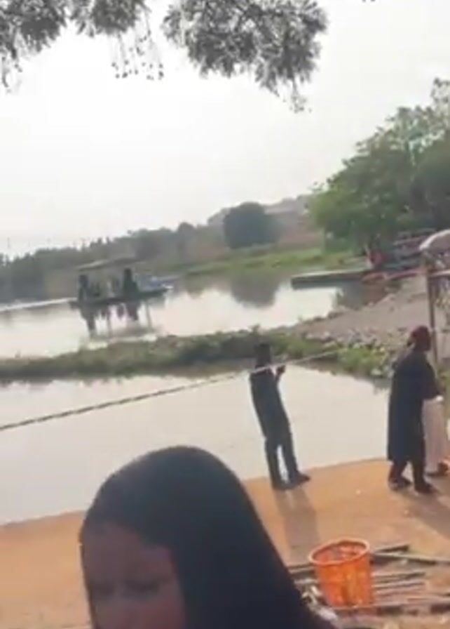 large crowd of people gathered near a body of water, possibly a lake or river, on a bright, somewhat hazy day. The crowd is diverse, with people of different ages and wearing various clothing styles. Many are dressed in casual attire. A significant number are wearing white or light-colored clothing. The shore line is marked off by yellow and black barricade tape. There are trees and other vegetation surrounding the water, and some buildings are visible in the background. There is a small dock with a boat in the water. The camera moves around, showing different parts of the scene, and captures the buzz of conversation.