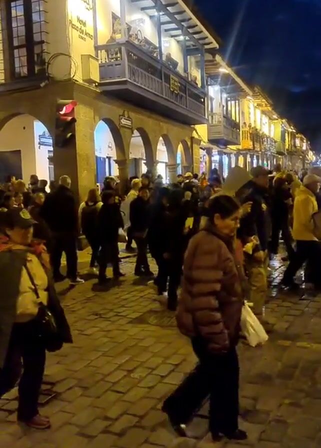 crowded street scene at night in what appears to be a city square. People of various ages and ethnicities are walking in different directions on a cobblestone street. Many are wearing jackets or coats, and some are wearing ponchos. The buildings on either side of the street have an old-world architectural style with arches and balconies. The buildings are illuminated by warm-toned streetlights and lights from within the buildings themselves. A sign on one building reads "Plaza" and "Hotel Plaza de Armas Cusco". The sky is dark, suggesting it is late evening or night.