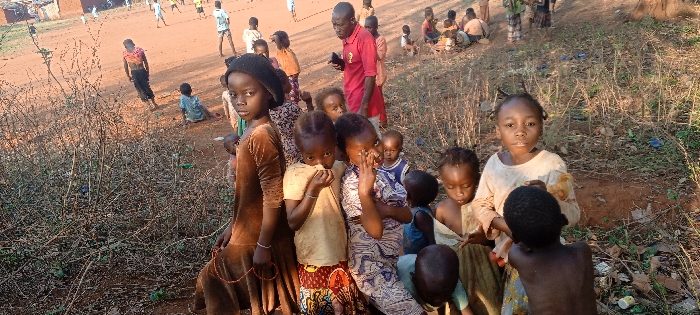 The image depicts an outdoor scene in Konongo, Democratic Republic of the Congo, featuring a group of individuals in a semi-barren, reddish-brown dirt area adjacent to a larger open field
