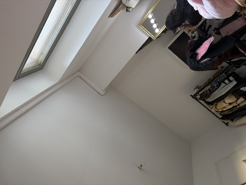 This image depicts the interior of a room, likely an attic or top-floor residential space, characterized by white walls and a slanted white ceiling. A white PVC conduit pipe is surface-mounted along the intersection of the slanted ceiling and a vertical wall. A rectangular skylight with a grey frame is integrated into the slanted ceiling in the upper right quadrant, allowing natural light into the space. On the left side of the ceiling, a basic light fixture with two exposed bulbs is visible. In the lower portion of the room, a black metal clothing rack, heavily laden with various garments including jackets, shirts, and scarves, is positioned towards the center-left. To the right, a gold-framed rectangular vanity mirror with four circular lights along its top edge is prominent. A person with dark, curly hair, wearing a dark shirt, is visible from the back, facing and interacting with the mirror, with their hands positioned near their head. Below the mirror, several bottles and containers are arranged on a surface. A fluffy pink textile object is draped over an item near the clothing rack, and another soft pink item is partially visible in the bottom right corner. A white door is partially visible in the lower left corner. The specific location within the city of Milan, Italy, is not discernible from the provided image.