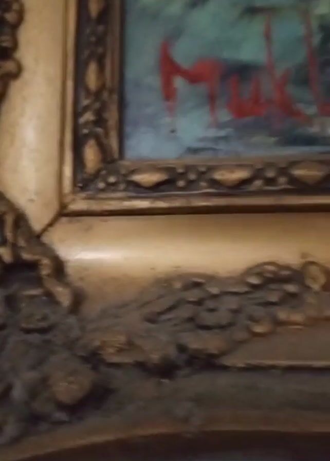 close-up of a painting's frame and a portion of the painting itself. The frame is ornate and gold-colored, with intricate designs. The painting, visible above and to the right of the frame, appears to have a blurred, abstract style with muted greens, blues, and a stroke of red that resembles a signature. The signature seems to read 'MUKLIS' in red ink. The background is a plain white surface. The camera seems to be moving slightly during the recording, and there is audible speech in the background.