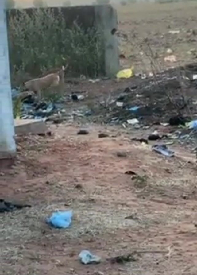 somewhat desolate landscape with scattered litter and two dogs. The dogs, one light brown and one darker brown, are near a concrete structure partially obscured by vegetation. The ground is reddish-brown dirt. Beyond the immediate foreground is a field stretching into the distance, under a hazy, early morning sky. The overall scene suggests an impoverished or neglected area.