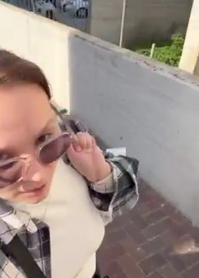 A woman in a white turtleneck, a black and white plaid shirt, and sunglasses walks down a brick sidewalk on a sunny day with a blue sky. She carries a white plastic bag filled with items. She turns the camera to show the bag as she walks. Buildings are visible in the background.