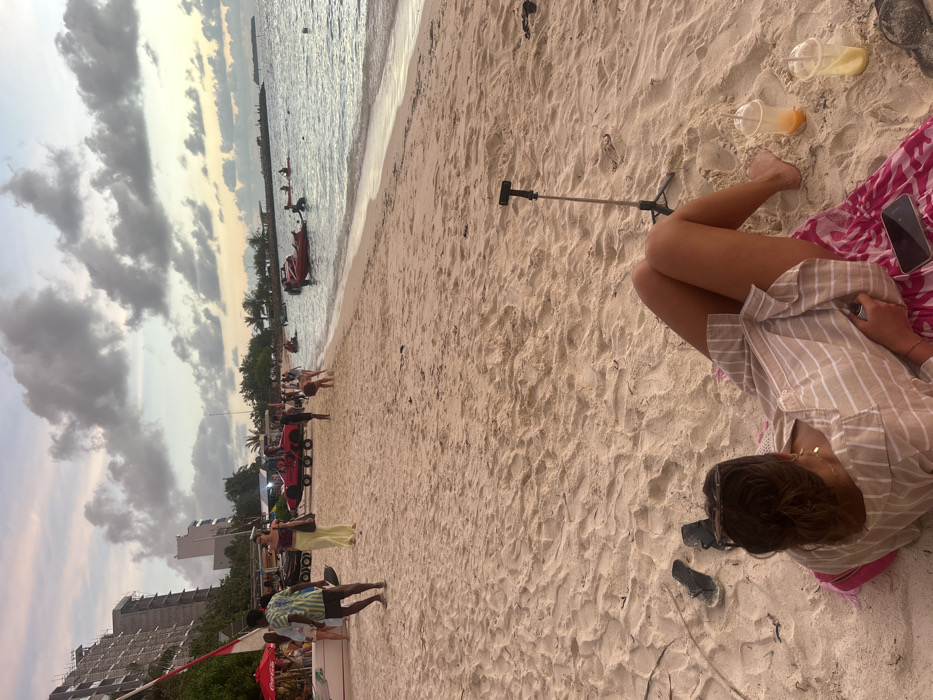The image depicts an active beach scene in Maafushi, Maldives, during twilight hours. In the immediate foreground, a person is observed lying prone on a pink and white patterned towel spread on light-colored sand. This individual, seen from behind with dark hair tied in a bun, is wearing a light-colored, striped button-up shirt and has their knees bent. A black smartphone rests on the towel near their left hand, and they appear to be holding a small dark object in their right hand. To their left, a pair of black flip-flops and dark sunglasses are present in the sand. To their right, two clear plastic cups containing orange and yellow beverages are positioned on the sand. A grey and black portable tripod or selfie stick stands upright in the sand further to the right. The midground features a sandy beach populated by numerous individuals. A man in a striped t-shirt and dark shorts walks from left to right. A woman in yellow wide-leg pants and a dark top walks towards the viewer. Several red all-terrain vehicles or modified golf carts are parked on the sand near the treeline on the left. Groups of people are clustered around these vehicles and walking along the beach. On the far left, a white boat hull and a red umbrella with "Coca-Cola" branding are visible, suggesting a concession or rental area. The background shows the tranquil ocean with several watercraft and structures. Red jet skis and smaller boats are moored near the shore, with individuals present both in the water and on the vessels. One person is visible on a kayak or paddleboard further out. A visible breakwater or small pier extends into the water on the right. Distant landmasses or islands are discernable on the horizon. Above the tree line on the left, multiple multi-story buildings, some appearing to be under construction with exposed rebar, are visible. Lush green tropical vegetation, including palm trees, lines the coastline. The sky exhibits soft hues of pink, orange, and pale blue, indicative of a sunset or sunrise, with scattered grey clouds.