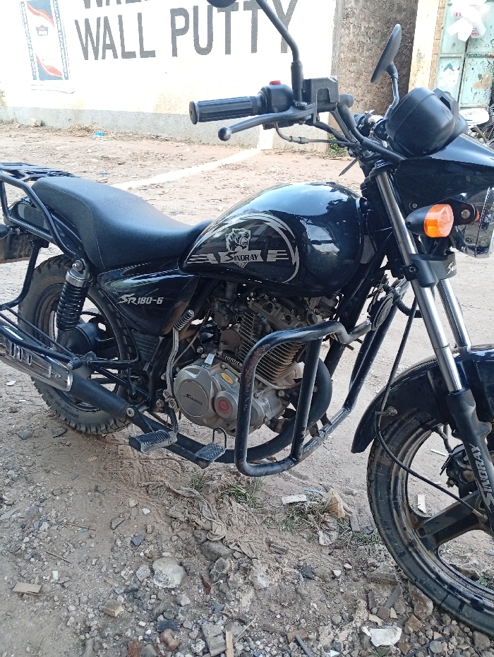- "The image displays a black Sinoray SR180-6 motorcycle parked on an unpaved, dirt and gravel surface in an unknown city" by FM-cqCds2, licensed under CC BY 4.0