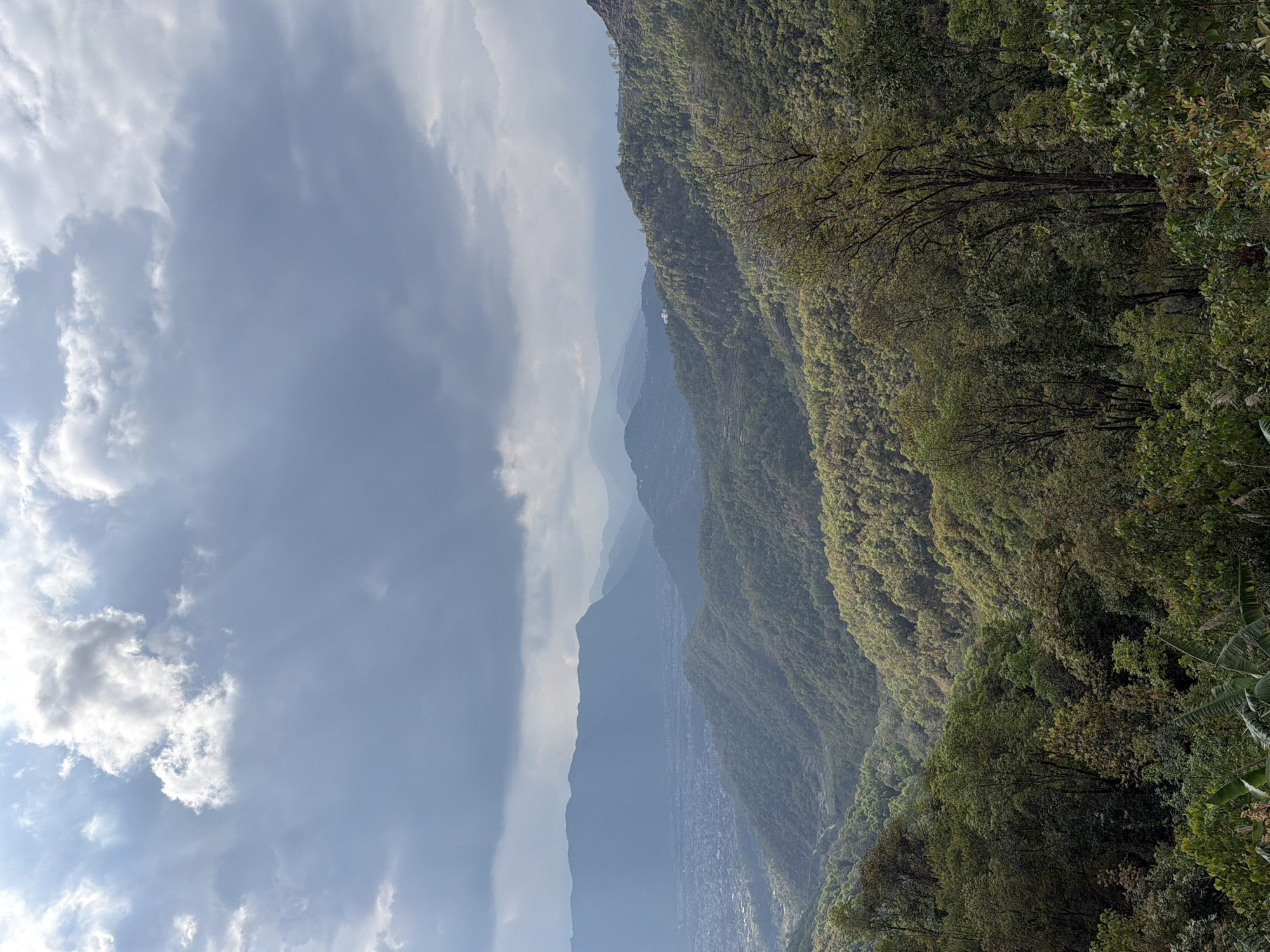 The image provides a panoramic view of the Pokhara Valley in Nepal, captured from an elevated position. The upper portion of the frame displays a sky with scattered light grey and white clouds, with sun rays visibly descending through a darker cloud mass in the upper left quadrant. The mid-ground features the city of Pokhara, a densely built urban area occupying the valley floor. Beyond the city, multiple layers of mountains recede into the distance, characterized by atmospheric haze. The foreground and mid-ground are dominated by steep hillsides covered in dense green forest foliage. A distinct white building is visible on a distant hillside to the right of the city. Terraced sections are apparent on some of the slopes. No individuals or dynamic actions are depicted within the frame.