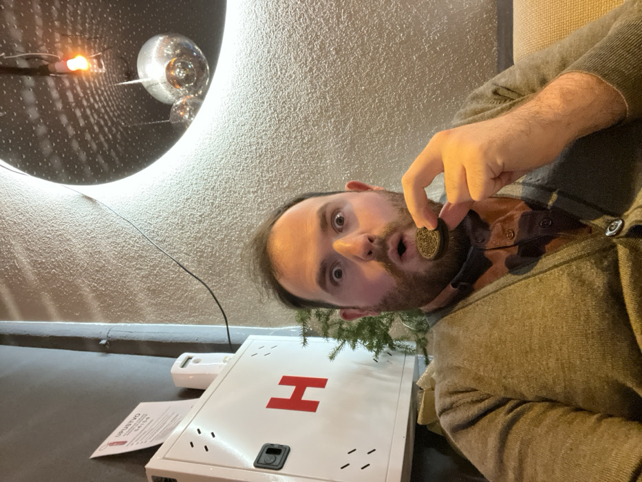 A man with a beard, wearing a grey sweater and a patterned shirt, holds an Oreo cookie in front of his mouth. He is looking at the camera with wide eyes and a surprised expression. Behind him is a textured wall with a circular light fixture, a white box with a red "H" on it, and a small Christmas tree branch. A black surface is in the foreground.