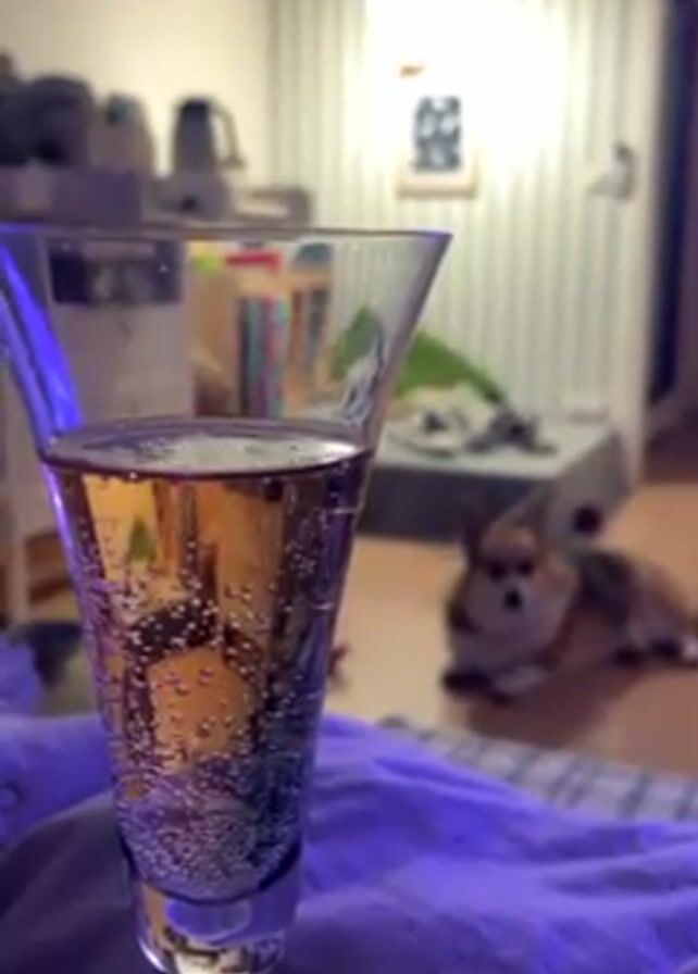 glass of sparkling wine, likely champagne, with visible bubbles. It's positioned in front of a background that includes a room with striped wallpaper and a fluffy lamp. A Corgi dog is lying on the floor. The lighting is a mix of natural and artificial, with a purple hue reflected in the foreground. A crib can also be seen in the background.