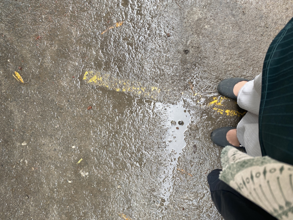 The image presents a top-down view of a wet, textured concrete or asphalt surface, indicative of an outdoor urban environment, such as a street or parking lot, in Unknown, Unknown