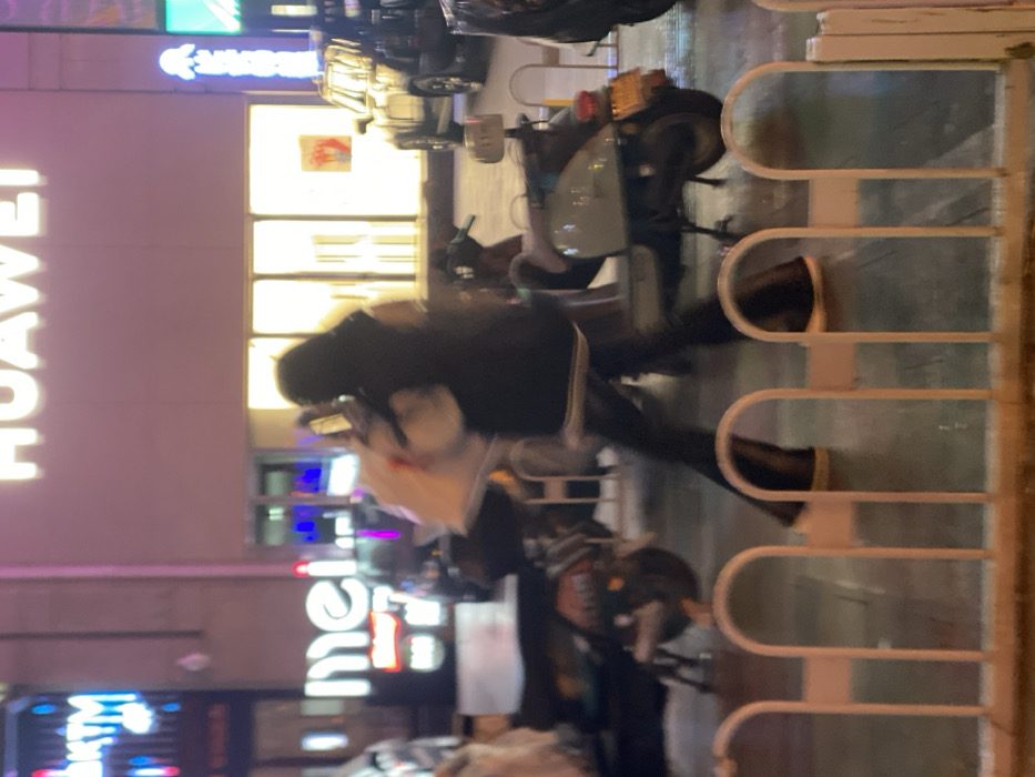 This image depicts a nighttime urban street scene in Linghe, China. A blurred individual, dressed in dark attire including a vest and dark trousers, walks from left to right in the midground, carrying a light-colored bag. The ground is wet, reflecting ambient light. In the immediate foreground, a white metal barrier or fence spans horizontally. Several two-wheeled vehicles, identified as scooters or mopeds, are parked in the midground; one light-colored scooter with a visible yellow license plate is prominent. The background features commercial buildings. A large, illuminated white "HUAWEI" sign is centrally located on a light-colored building facade. To its left, a partial illuminated sign displaying "mei..." is visible. Further to the left, a blue neon sign with partial red lettering is visible. To the right of the HUAWEI store, another vertical blue neon sign is illuminated. A dark-colored SUV or jeep-type vehicle is parked near the HUAWEI storefront on the right side. The scene is illuminated by numerous artificial light sources from storefronts and neon signs.