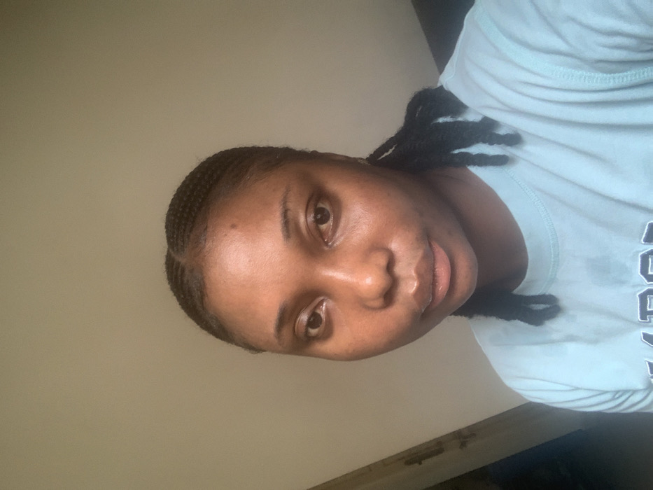 A close-up, frontal portrait photograph captures a female individual in an indoor setting in Abuja, Nigeria. The subject, with medium to dark brown skin and dark eyes, gazes directly at the camera. Her hair is styled in flat braids (cornrows) on the scalp, which transition into longer, dark braids that extend past her shoulders, visible on either side of her neck and chest. She is wearing a light blue, short-sleeved t-shirt, with a partial dark design or lettering visible on the chest area. The background is a plain, light-colored wall, with a faint vertical dark element partially visible along the far left edge of the frame. The scene is illuminated by soft, direct lighting.
