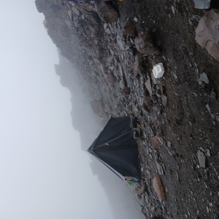 The scene depicts a high-altitude, rocky landscape located in Unknown, Tanzania, under conditions of dense fog. A single, dark-colored, A-frame tent is centrally positioned on uneven, dark grey and brown scree and angular rock formations. The tent is secured with visible guy lines, including a yellow-green one extending from its side. To the right of the tent, a white, rectangular plastic container with a handle rests on the ground. The background features a steep, ascending rocky slope that disappears into a uniform, thick white fog, obscuring the horizon. No individuals are present, and no discernable actions or interactions are depicted. A vertical object with purple and yellow coloration is partially visible on the extreme right edge of the frame.
