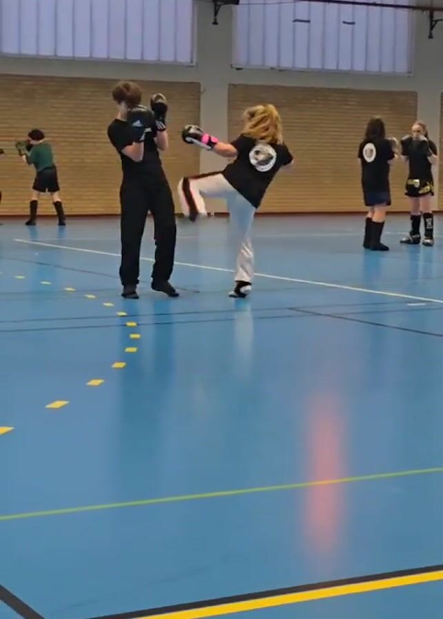 In a medium-shot video taken inside a gymnasium with a high ceiling and blue floor with yellow and black lines, two people are practicing martial arts with black gloves and black clothing. The individual facing the camera has blonde hair, and is wearing sweatpants. They are sparring, punching and kicking. Two other people can be seen in the background practicing martial arts, and one person can be seen walking in the background. The wall is brick. There is a scoreboard in the back that reads “19:01”.