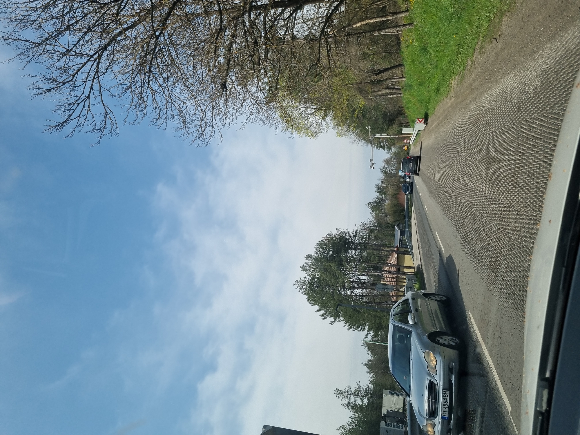 road in Sheremetia, Bulgaria, with vehicles traveling on it. A silver Mercedes-Benz with license plate "BT 4864 BH" is visible in the foreground. The road is lined with trees on both sides. There are traffic signals and signs present on the road. The sky is blue with some clouds.