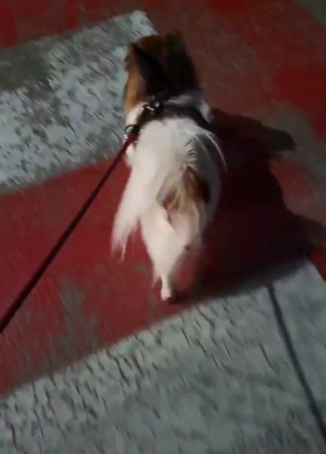 dog on a leash walking on a crosswalk. The dog is small with brown and white fur. The crosswalk is marked with red and white stripes. The ground has a cracked appearance. The video is somewhat shaky.