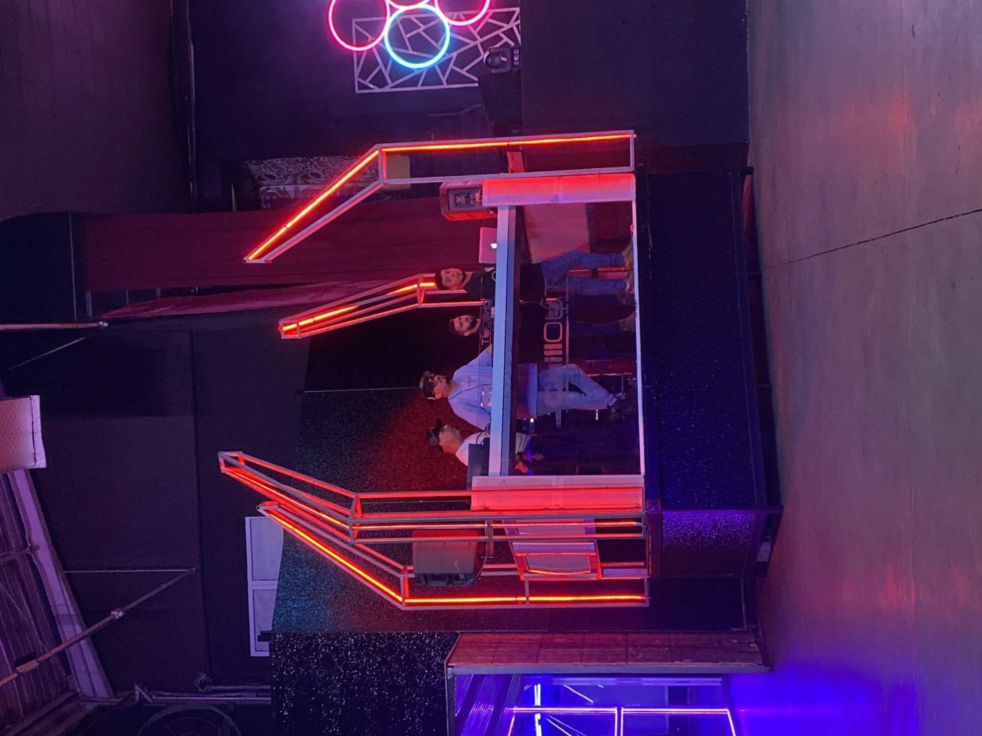 The image depicts an indoor event space in San Diego, Venezuela, characterized by dim lighting and vibrant neon illumination