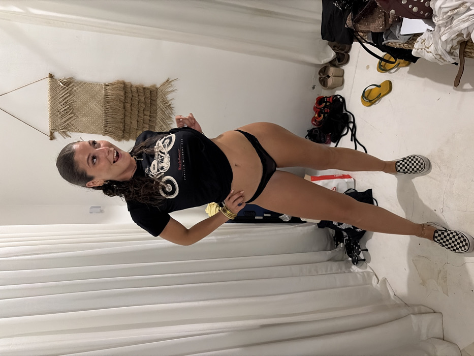 The scene depicts an interior room, potentially a changing area, located in Pecatu, Indonesia. A single adult female stands centrally, facing slightly left with her head turned right, mouth open in an expression of surprise or delight. She has dark, curly hair and is attired in a black short-sleeved t-shirt featuring a white motorcycle graphic with "DEUS PECATU MOTORS" text. Her right hand is lifting the t-shirt to expose her midriff and black bikini-style underwear with lace trim. She wears black-and-white checkered slip-on platform shoes, gold-toned bangles on her left wrist, and a thin gold-toned anklet on her left ankle. The room has white walls and a white floor. White fabric drapes vertically on both sides of the frame. A rectangular wall hanging, constructed from woven natural fibers with a tiered fringe design, is affixed to the rear wall. The floor space to the right is cluttered with various footwear, including black athletic shoes, black sandals, tan slip-on shoes, and yellow flip-flops, along with assorted bags (black duffel, brown woven, gold sequined) and a basket containing fabric items. A white shopping bag with red lettering is partially visible behind the subject's left leg, alongside a dark, multi-tiered stand.