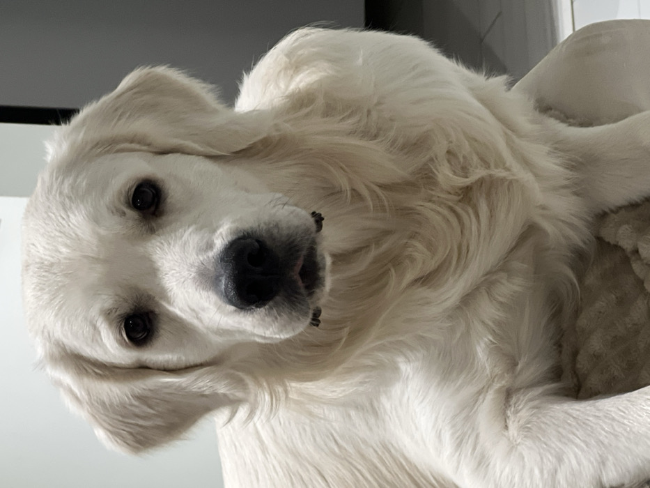 A white Great Pyrenees dog looks directly at the camera with a tilted head