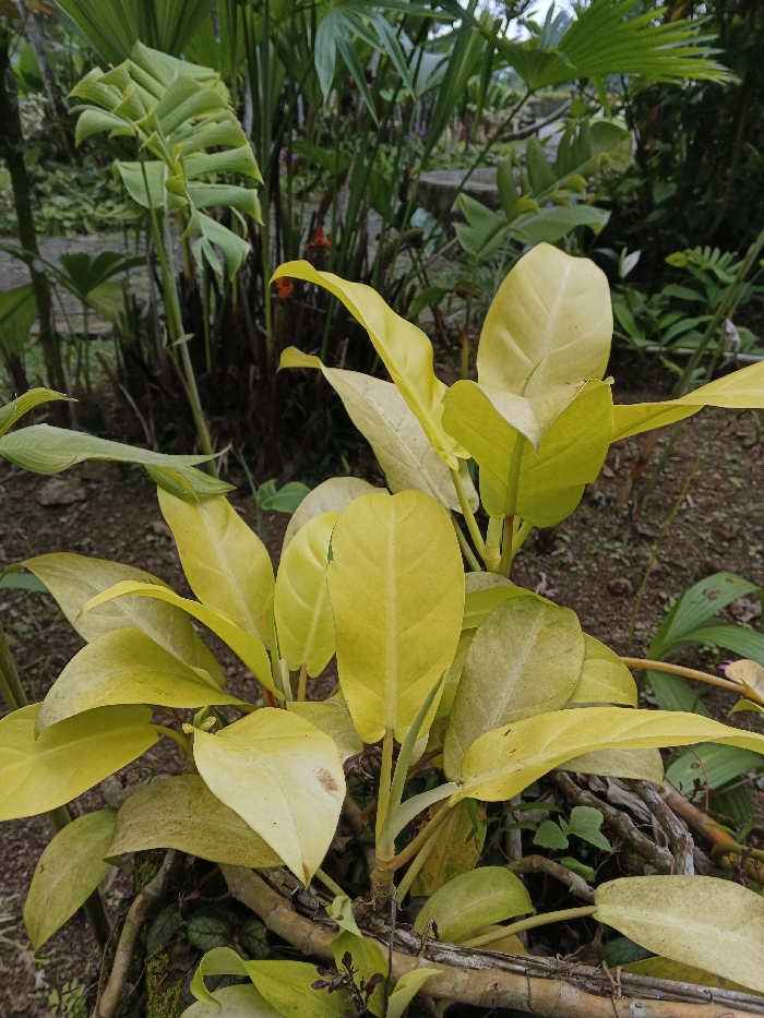 The image displays an outdoor vegetated area within Trairão, Brazil. The foreground features a dense cluster of a broad-leafed plant characterized by numerous ovate leaves primarily in various shades of yellowish-green. Several leaves exhibit lighter coloration on their undersides and some minor brown discoloration or spotting on older foliage. The plant's robust stems are visible, along with intertwined root-like structures at its base. The background consists of lush tropical flora, including deeply lobed green leaves indicative of a *Monstera* species, various palm fronds, and other dense green foliage. Patches of dark, exposed soil are visible between the plants. The scene is illuminated by diffused natural light. No people, animals, man-made structures beyond the plants themselves, or specific actions or interactions are depicted.
