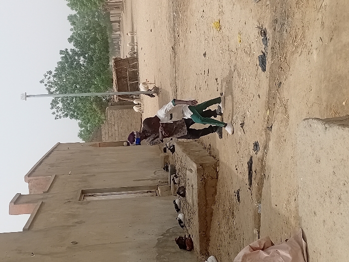 The image depicts an outdoor scene in Ayama, Nigeria, characterized by dusty, unpaved ground under a hazy sky