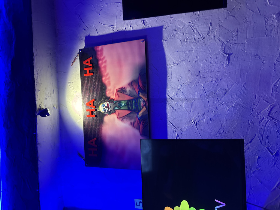 The scene depicts an interior space within As-Salihiya Municipality, Syria, illuminated primarily by blue light. A large, rectangular framed picture of the character "Joker," wearing a red suit and green vest, is centrally mounted on a textured purple-blue wall. The Joker figure is seated, and the background behind him features reddish smoke and a brick wall pattern at the top. Above the figure, the words "HA HA HA" are displayed in red, stylized lettering. A black spotlight is affixed to the ceiling, casting a yellowish light onto the upper portion of the picture. To the left, a flat-screen television partially displays a colorful, petal-like logo and the letters "TV" on a black background, with a white numeral "5" visible on an adjacent dark surface. To the right, another flat-screen television is partially visible, showing a black screen. The ceiling is a plain, light color.