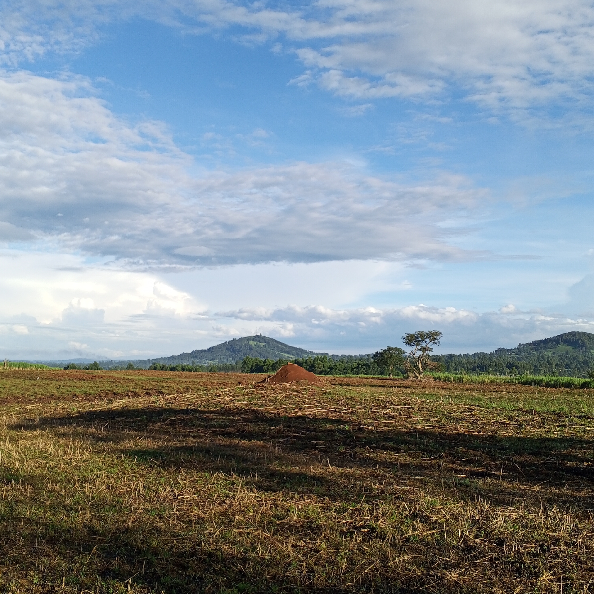 The image displays an expansive agricultural field located in Keyian ward, Kenya. The foreground consists of tilled, brown earth intermingled with dry plant stalks and scattered patches of green grass, indicative of a harvested area or land prepared for planting. Elongated shadows are cast across the field, suggesting a low sun angle. In the midground, a conical mound of reddish-brown soil is visible towards the center, flanked by a solitary, mature tree with a wide canopy and a smaller tree to its right. Beyond this, a strip of dense green vegetation, possibly crops, extends horizontally. The background features several rolling hills, densely covered with green foliage; one prominent central hill exhibits faint structures near its peak. The distant horizon appears hazy. No human figures, animals, or active objects are present within the scene.