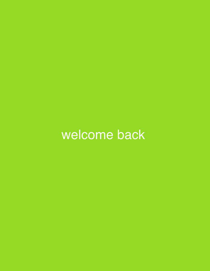 A solid, uniform light green background fills the frame. Centered vertically and horizontally in the middle of the composition is the text "welcome back" in a sans-serif font. The text is white, contrasting with the green background. There are no other elements in the image.