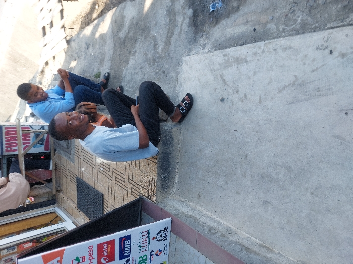 This image captures an outdoor urban scene on a sunny day in Dar es-Salaam, Tanzania, adjacent to a commercial building