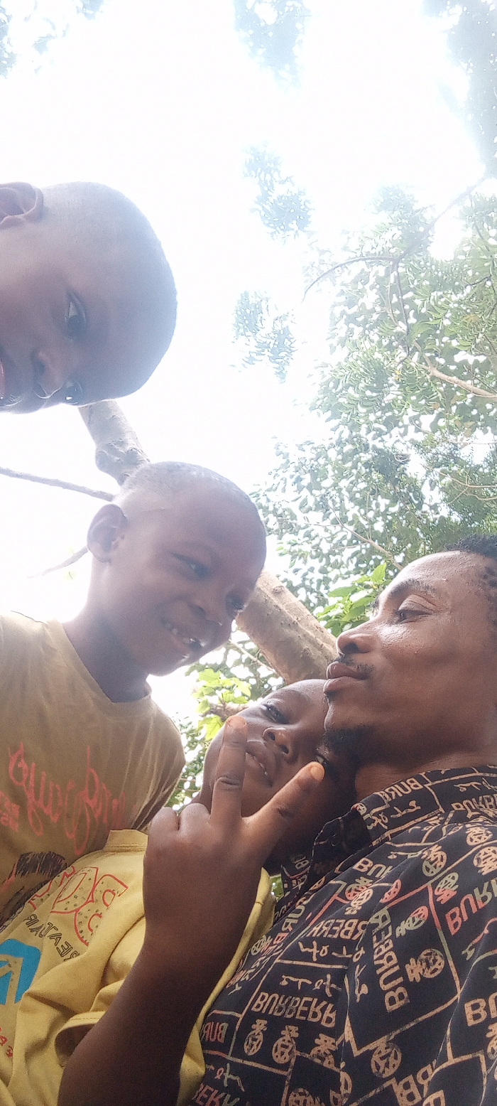 A low-angle outdoor image captures four individuals, positioned against a bright, largely overexposed sky with green foliage and tree branches visible in the background, suggesting a natural or semi-urban setting. One adult male is positioned on the right, facing partly left in profile with his head tilted upwards. He has short dark hair and a beard, and wears a dark collared shirt patterned with light-colored text and symbols, including "BURBERRY" and a circular logo. His left hand is raised, forming a 'V' sign with the index and middle fingers, resting near the cheek of a child. His lips are slightly puckered. Three children are present, appearing to be African males. - One child, partially visible at the top left, looks directly towards the camera. - A second child, below the first and to the left of the adult, smiles broadly, displaying teeth. This child wears a light brown t-shirt with faded reddish lettering. - A third child's head is visible between the smiling child and the adult male, looking towards the camera. This child wears a yellow t-shirt with red and blue designs, and leans against the adult male, with the adult's fingers near their face. All individuals are in close proximity, indicating a posed group interaction. The bright sky and overhead perspective suggest the photo was taken looking upwards, possibly a selfie. The exact location within the city of Adankolo, Nigeria, is not discernible from the provided visual information.