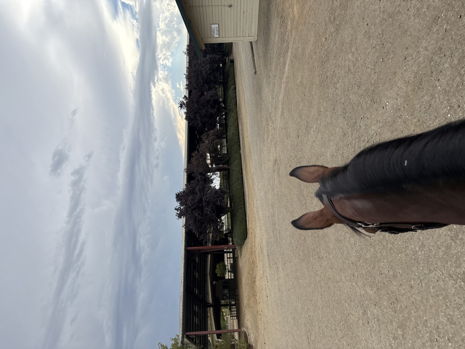 - "The image presents an outdoor equestrian facility under an overcast sky, viewed from a first-person perspective over the head and ears of a dark brown horse wearing a brown leather bridle" by FM-kFRzb2, licensed under CC BY 4.0