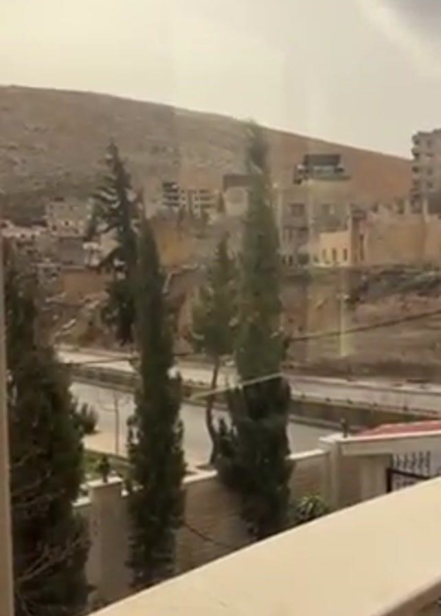 view from a balcony overlooking a road, trees, and buildings in a hilly, possibly Middle Eastern, landscape. The buildings are a light tan color and appear relatively close together, typical of a town or city built on a hillside. There is sparse vegetation and the sky is overcast. The wind is blowing through the trees. A vehicle can briefly be seen moving along the road. The balcony has a white railing and the shot seems to be taken through a window or from behind a clear barrier. The overall atmosphere is somewhat hazy or dusty.