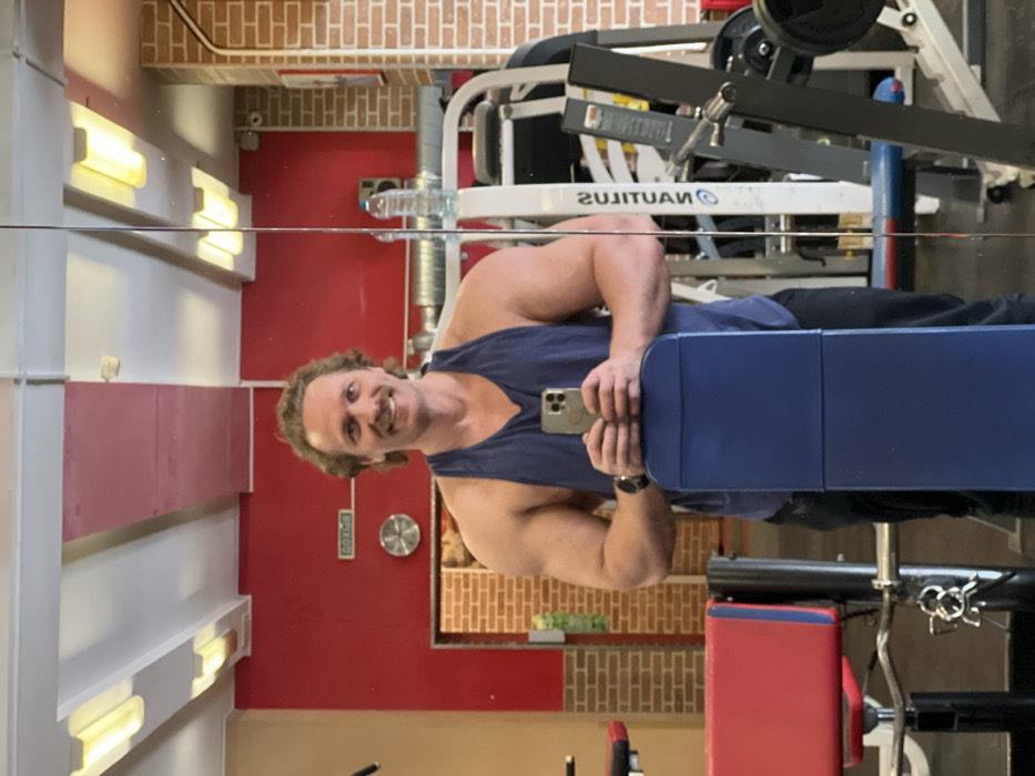 An athletic male individual is depicted taking a mirror selfie inside a gym located in Saint Petersburg, Russia