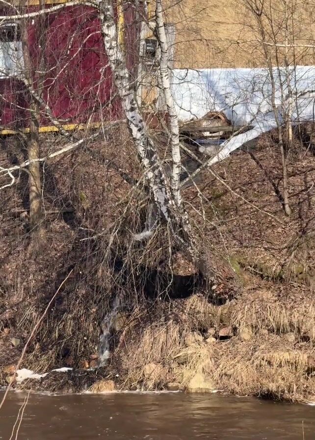 muddy riverbank on a sunny day. The river is brown and slightly turbulent, with some foam visible along the edge. The bank is covered in dry grass and shrubs. A small stream trickles down the bank into the river. A red building with a white window is visible behind the trees. There is a patch of snow on the ground further up the bank. Several bare trees are present throughout the scene. The camera pans slightly from left to right.