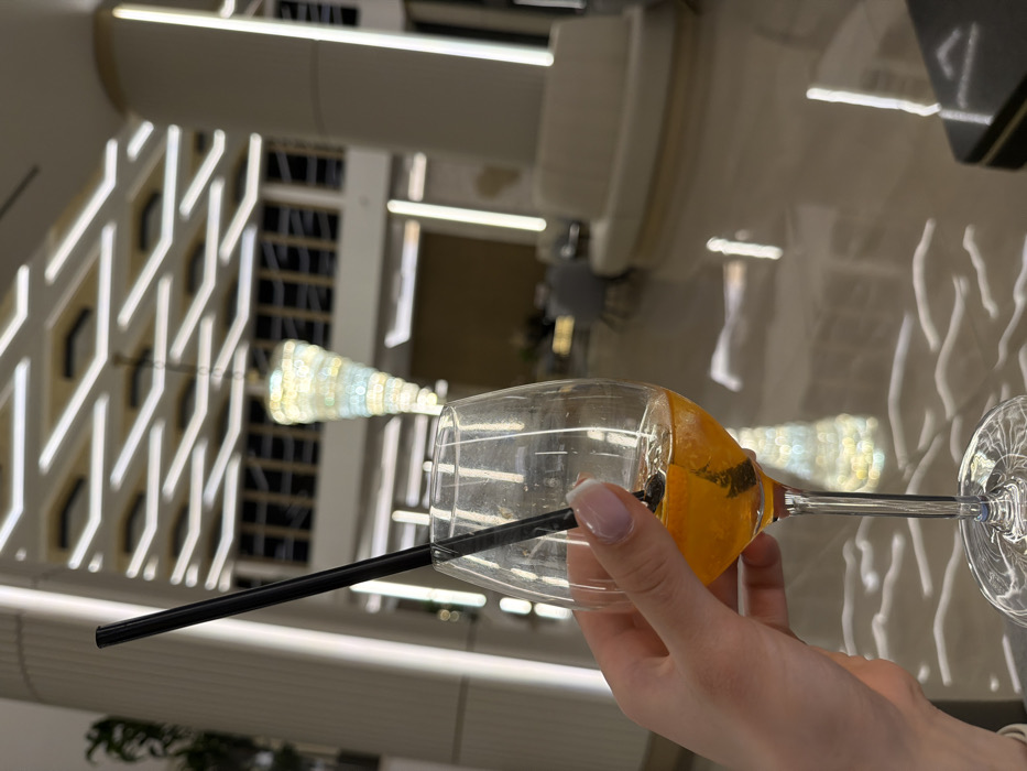 A human hand, with manicured nails featuring a natural-looking finish, holds a clear stemmed wine glass in the foreground. The glass contains an orange-hued beverage, ice, a visible orange slice, and a black plastic straw. The scene is set within an upscale, brightly illuminated modern interior, identified as being in Kazanlak, Bulgaria, likely a hotel lobby or lounge. A prominent, multi-tiered chandelier, conical in shape and composed of numerous luminous elements, hangs from the ceiling. The ceiling itself features a distinct geometric grid pattern with integrated linear lighting. Large, light-colored architectural pillars are visible, some equipped with vertical strip lighting. The polished, highly reflective floor surface mirrors the overhead lighting and structural elements. In the soft-focus background, indistinct modern lounge seating arrangements and large windows with visible horizontal elements are discernible.